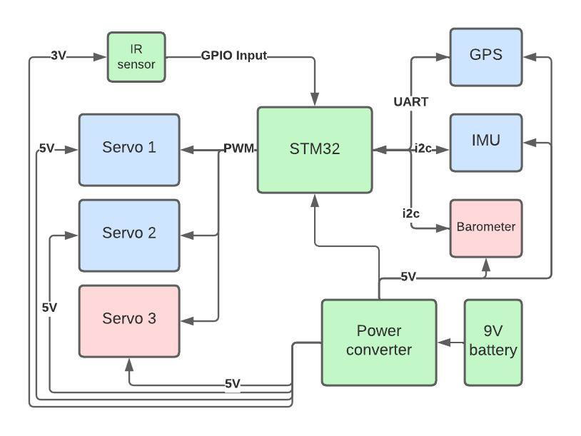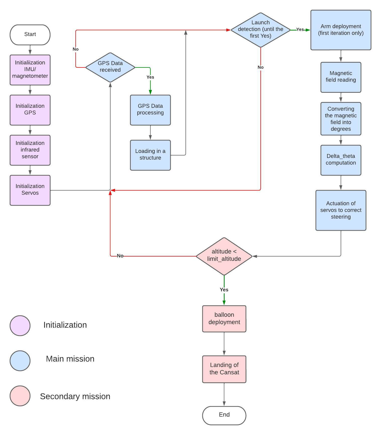 - Software solution For the software, we are using C language. We developed two versions : one bare metal and one FreeRTOS. We had a problem near the end with the FreeRTOS version (with the GPS data reception) so we had to use the emergency bare metal solution. It is the one that we will present now : During the first iteration of the main function, we start by initializing all the drivers: IMU, GPS, infrared sensor and servos. By initializing the servos, it is a question of placing them in a position that allows the Cansat to enter the release capsule (indeed, if the arms are deployed, the Cansat does not contain in the capsule). When initialization is complete, we enter the while infinite loop. The first step in an iteration of this loop is to check if GPS data has been received (using a flag placed in the callback function of the UART, in interruption mode). If this is the case, the character string is processed, useful data (longitude, latitude and altitude) are extracted and are then stored in a structure. Then, the software is monitoring the detection of the drop. This detection is operated by an infrared sensor which activates a flag the instant the Cansat exits the release tube. Once the launch is detected, the Cansat enters the “drop phase” : it deploys its arms and starts correcting its direction by measuring the local magnetic field and using its GPS position. Finally, when the Cansat is below the pre-determined altitude limit (15m above ground level), the inflation system is activated and releases the balloons.