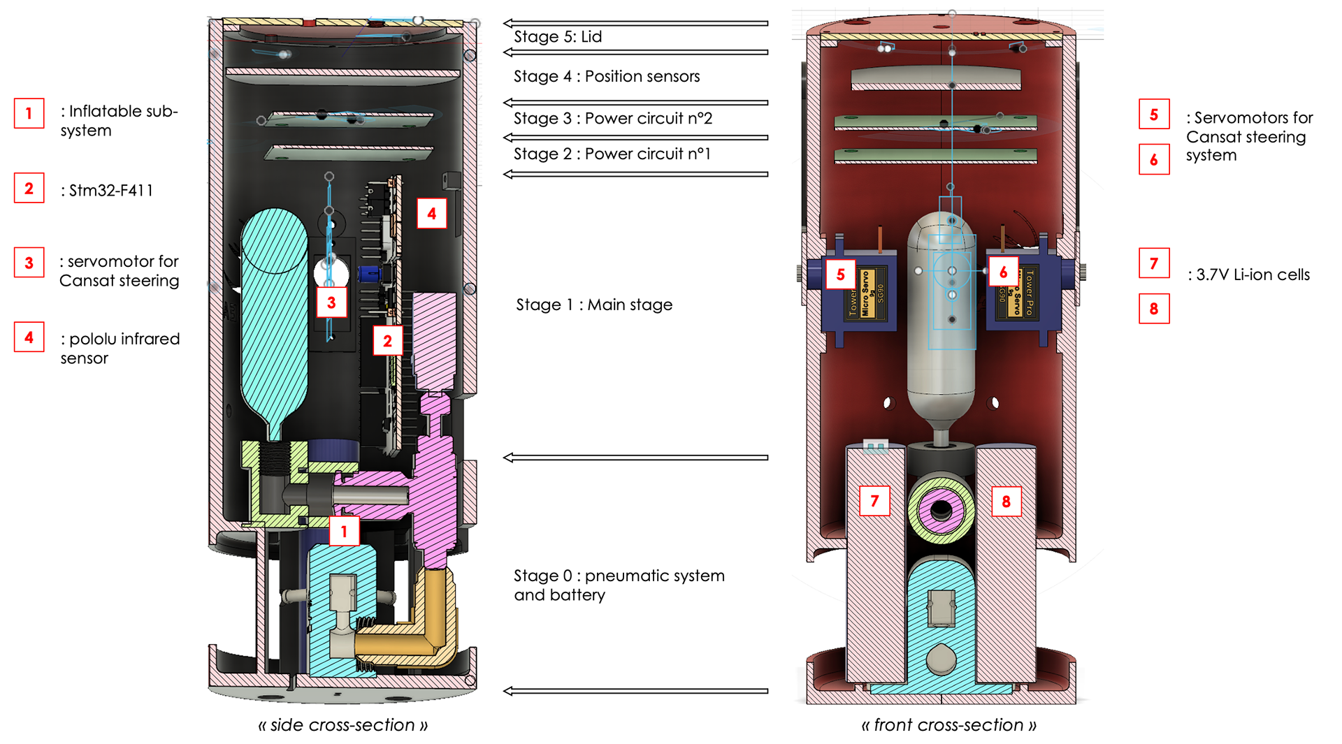 “The CanSat is an autonomous device simulating the landing of a probe on a planet and capable of carrying out scientific missions. The principle of the CanSat is based on the idea of designing, in a reduced volume corresponding to a soda can, a payload similar to that carried by a satellite/probe. Originally 33cL, our competition category requires a volume of 1L for a height of 20 cm and a diameter of 8 cm. All satellite systems, such as power supply, measurement and telemetry devices, must be designed to fit into the reduced volume of the CanSat. It is released using a drone or tethered balloon, and carries out its missions from release, during descent and up to 5 minutes after landing. The missions proposed involve the implementation of scientific experiments from the definition phase through to the analysis of the data collected. The aim of the CanSat France competition is to build a CanSat prototype capable of carrying out the missions defined each year by the Planet science organization. The final part of the project is the competition that brings together all the participating teams, during the summer, at the national C’Space launch campaign, in the presence of representatives from CNES (National French Space Center), Planet Science and the space industry.” according to the Cansat 2023 régulation